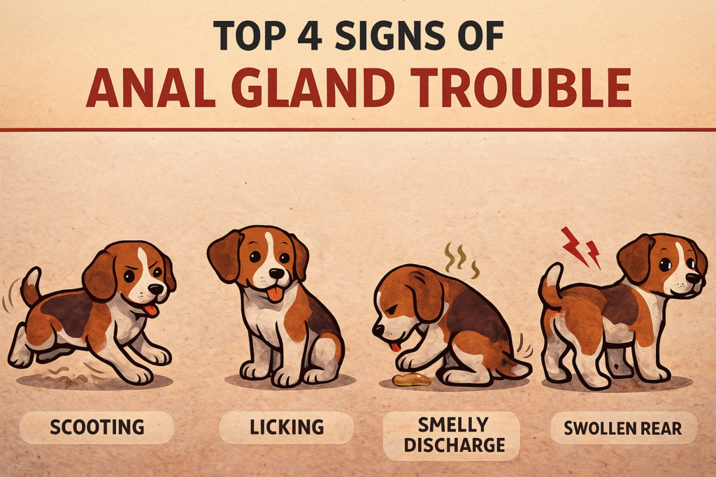 Imagine your dog after a long day: usually calm but today she keeps scooting across the lawn, licking her rear, and yelping when you try to touch her tail base. Sometimes the first sign is subtle — a damp patch on the tail base, a sudden increase in rear-end licking, or changing stool consistency. As the gland fills, the dog may show more obvious discomfort: scooting, straining to defecate, a bad — often fishy — smell, licking or biting the area, and if infection sets in, swelling or redness near the anus and possibly a clear, bloody or pus-tinged discharge. In severe cases a dog may cry out because of pain, become withdrawn, or show signs of low appetite and fever. These are not subtle problems: pain grows, behavior changes, and the dog needs attention.