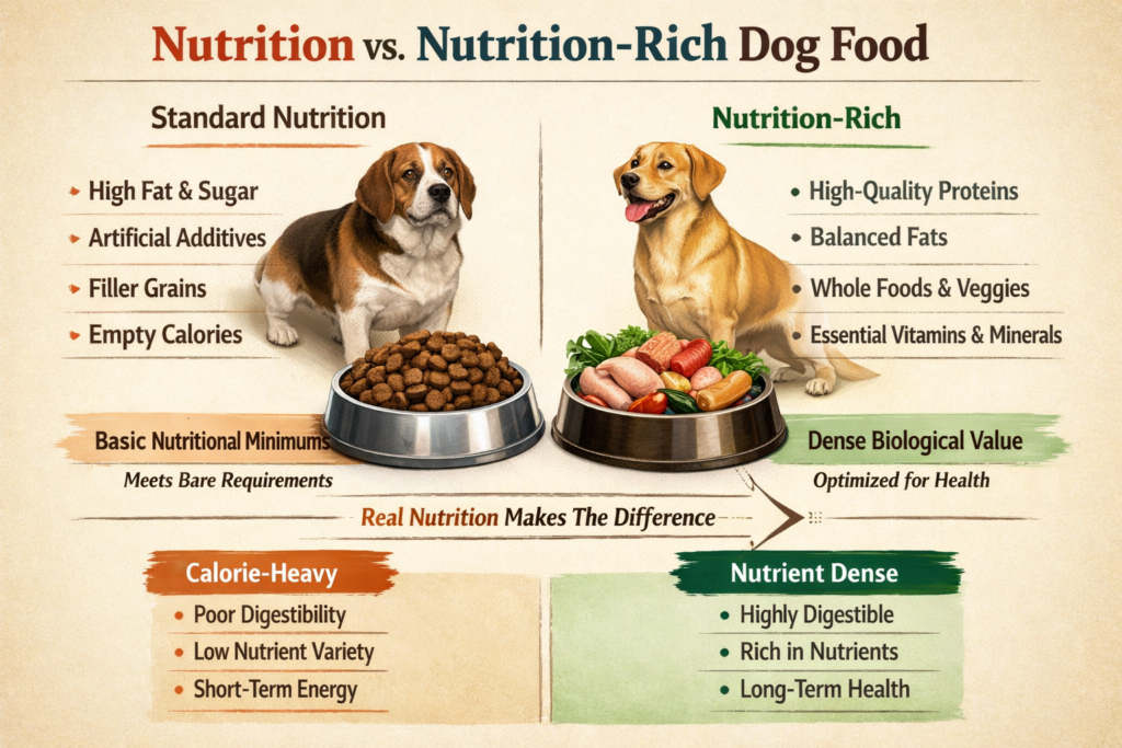 At a basic level, nutrition just means a food meets minimum requirements. It supports growth, maintenance, and general health. This is the foundation—it keeps a dog alive and functioning.